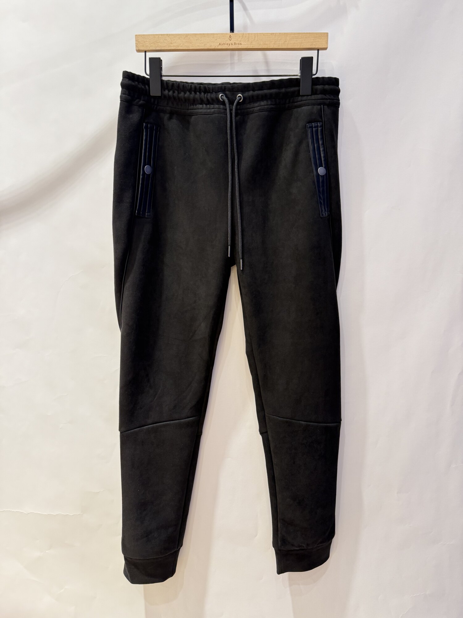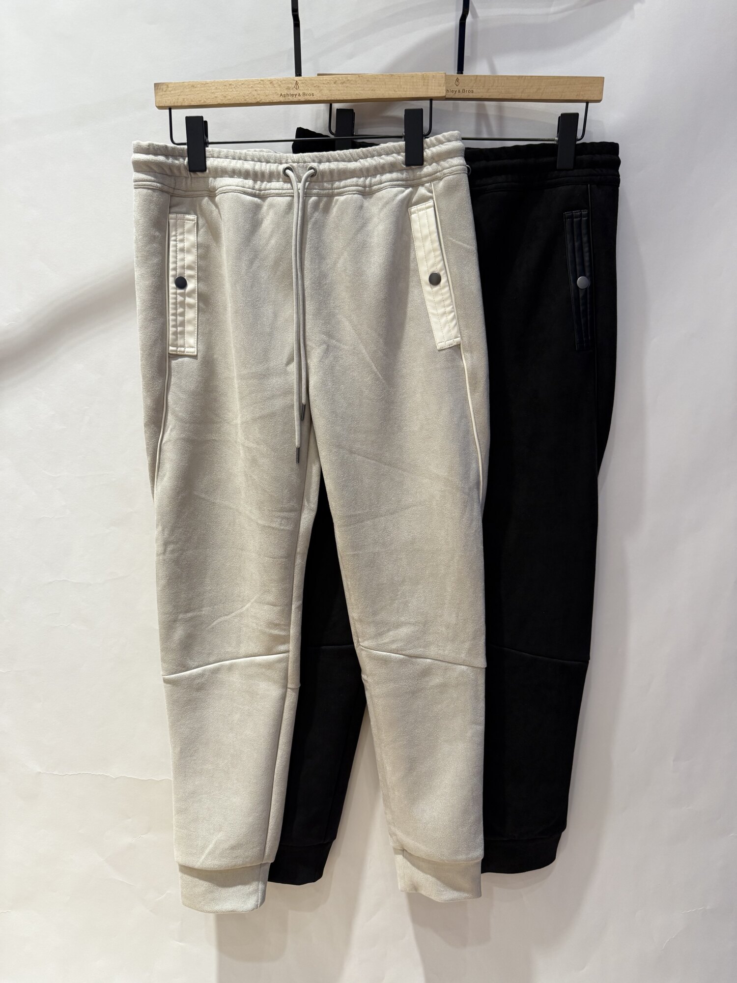 フェイクスエード地にフェイクレザーのパイピングをあしらった
