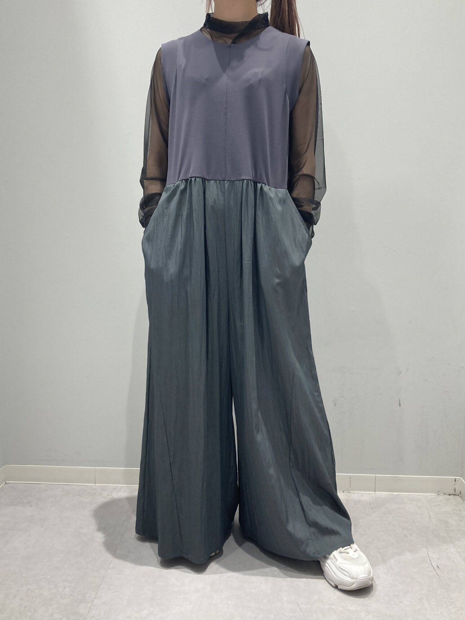 異素材切替が目を惹くオールインワン。